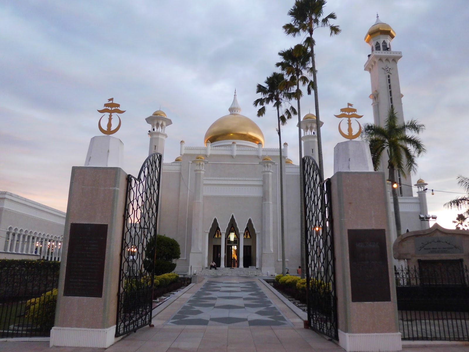 Comimos enfrente en una terraza entarimada. 8$Br-2´5€pp. Y alli mismo tomamos el bus 20 (valía también el 1 o el 22) a la otra gran mezquita: JAME´ASR HASSANAL BOLKIAH (el nombre del actual sultán). A 3km del centro. La más grande y espectacular, con su diseño islámico y su historiado interior que se permite visitar a horas determinadas (Descalzo y con decoro. Además, las mujeres han de colocarse una túnica negra que ellos te prestan)