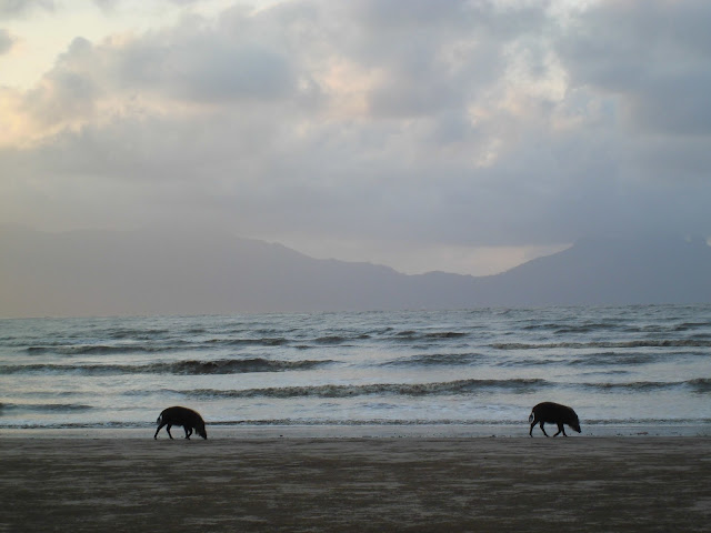 Asomarse a la puerta no tenía precio: Bajo el porche correteaban unos jabalines barbudos ¡y por entre las copas de los árboles saltaban una colonia de monos narigudos!